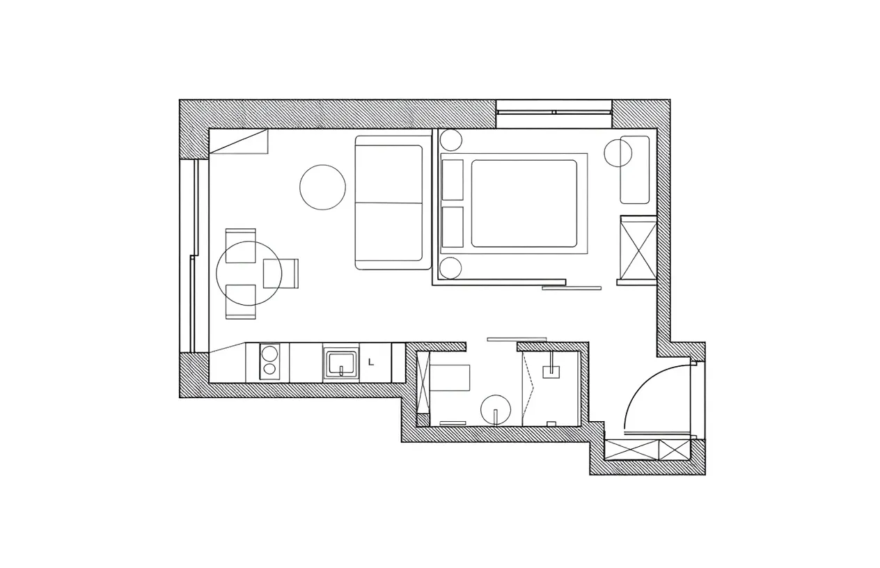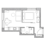 Salon z aneksem kuchennym | Sypialnia oddzielona przesuwnymi drzwiami | Łazienka