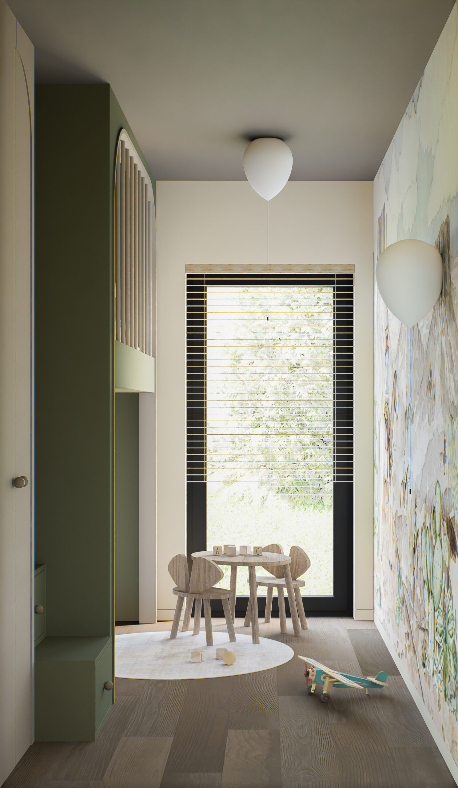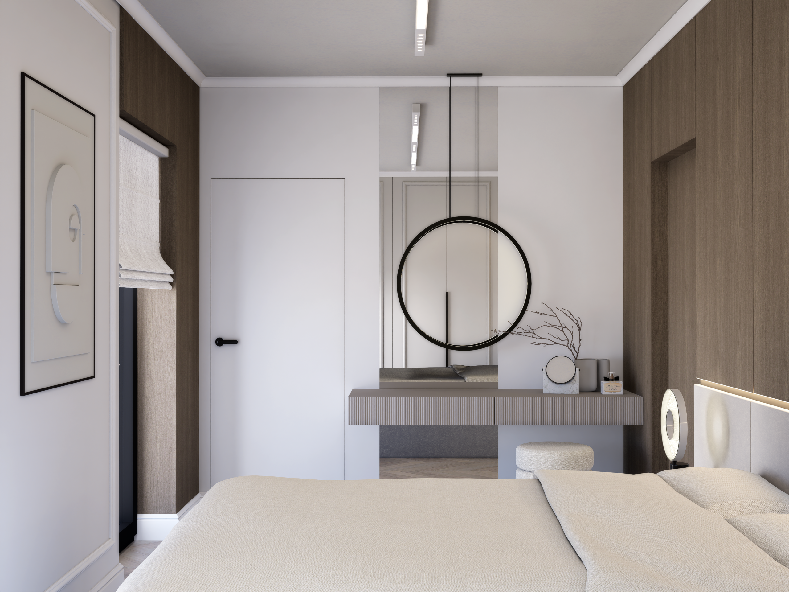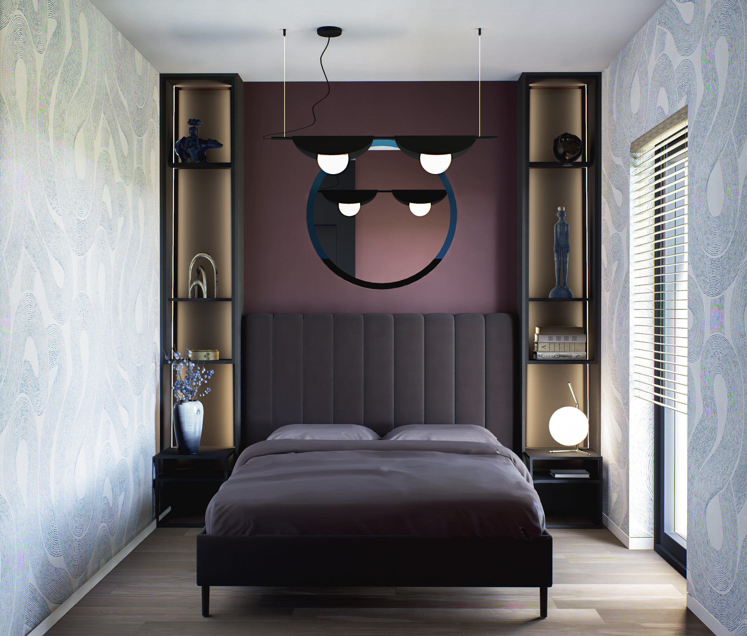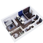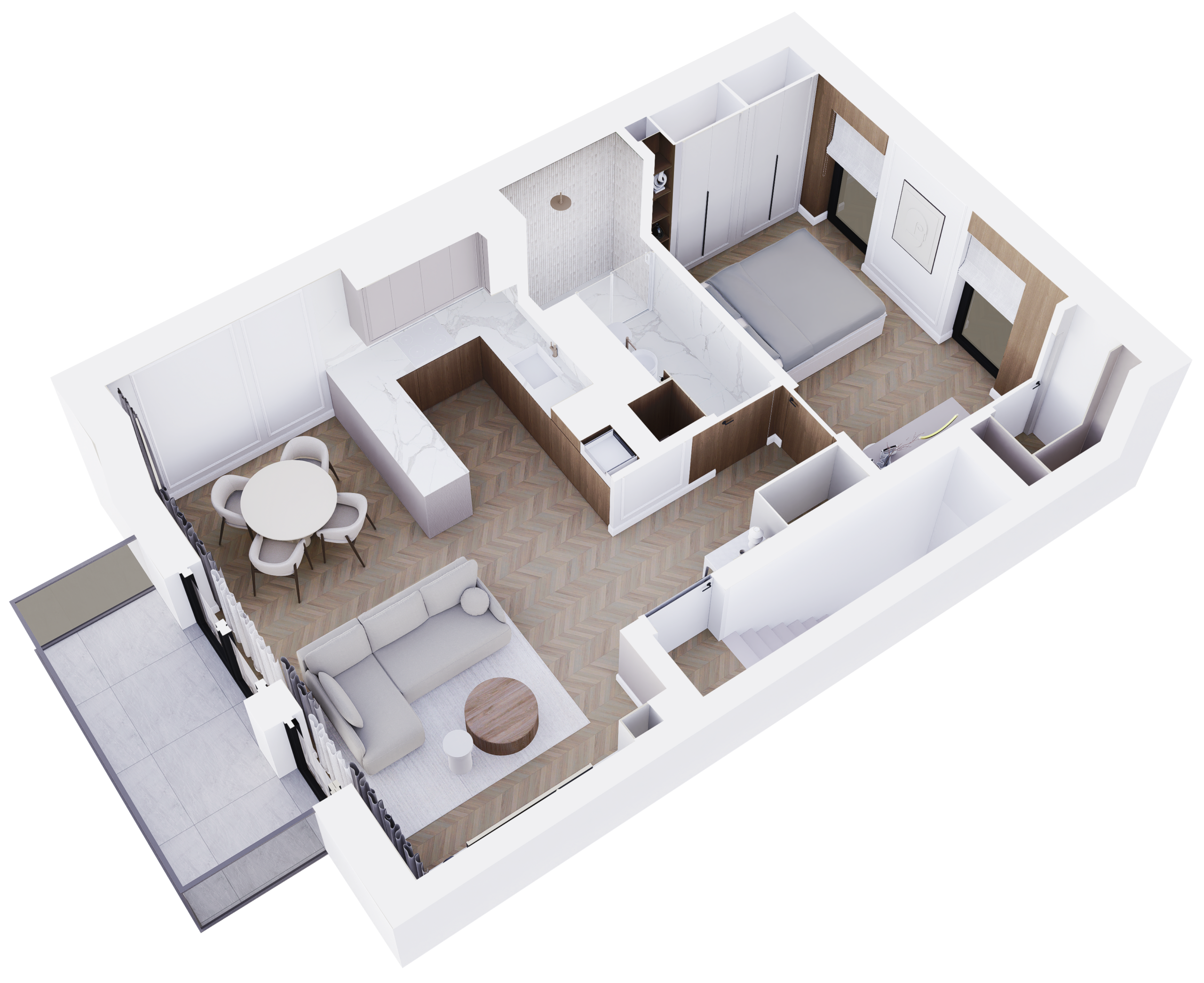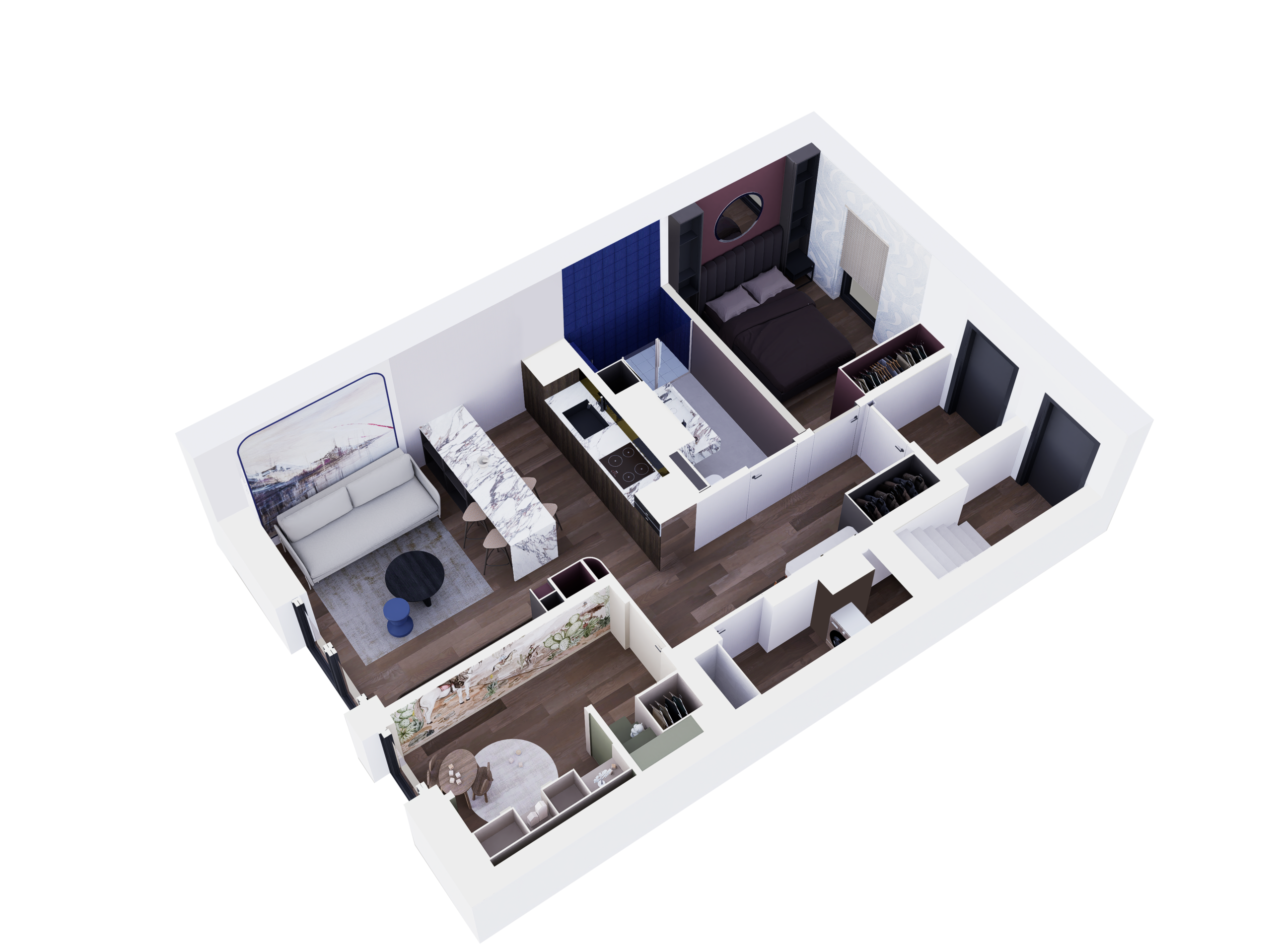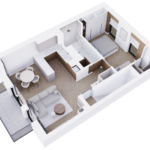 Mieszkanie na piętrze wizualizowane z 2 pokojami (zlikwidowana jedna sypialnia) – to tylko przykład.